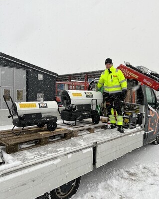 Micke lastar sprillans nya dieselkanoner i snöyran. Klistret på dekalerna hann knappt fästa innan de skickades ut till Meva Energy. De säger att det är lite kallt på bygget.