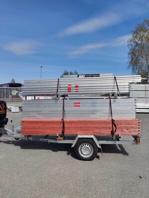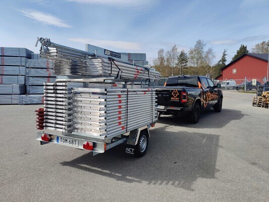 Idag har vi tagit en tur till Bålsta och hämtat upp vårt nya ställningssläp. Perfekt produkt för husmålning eller takbyte. Släpet har en totalvikt på 1300kg och rymmer en fasadställning på 118m2. Grundkonfigurationen är en långsida på 18x6m med två bomlag. Men vi har även köpt till delar så att den går att bygga om för att täcka en gavel på 9x6m + gaveltopp. Det ingår även 12m fackverksbalk som används som kan monteras på husgaveln för att användas som fallskydd.