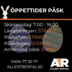 Hyr maskiner hela påskhelgen men betala bara för två dagar! Utlämning torsdag mellan 15-16 och återlämning tisdag mellan 7-8.