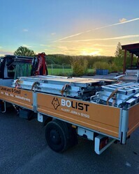 Soluppgång och lastbilen är lastad med två rullställningar redo att levereras till kund.