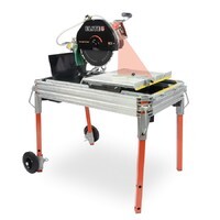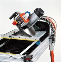 Vattenkyld diamantsåg. 2200 W. För t.ex. tegel, betongplattor, marksten, granit, marmor etc. Jollykapning genom vinkling av motorn. Höj och sänkbar motor/klinga. Kullagrat sågbord. Chassi och bord i aluminium. Integrerad benställning med hjul.