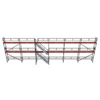 Grundkonfigurationen är en långsida på 17.92x6m med två bomlag. Vi har olika lösa delar man kan hyra till för att bygga ställningen på olika sätt. Exempelvis lägre ramar för att kunna justera höjden, L-gavlar för att kunna bygga runt hörn, botten-skruv för att kunna utöka ställningen på längden, skyddsräcke för takgavel.