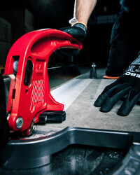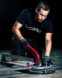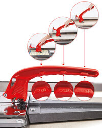 Proffsskärare med robust konstruktion, push-funktion och fjädrande plattstöd. Helgjutna och stabila stödarmar. För kapning av keramik med max plattjocklek upp till 20 mm. Behöver inte justeras för olika plattjocklekar. Ställbar tydlig linjal från -45° till +45°. Tydligare synlighet mot trissan för ökad precision. Unikt handtag med kraft-indikatorer och ”snabbknäck” (behöver inte backas eller ritsa bakåt i startläge). Anhållet kan placeras nära skärlinjen.
